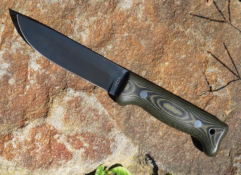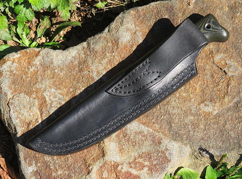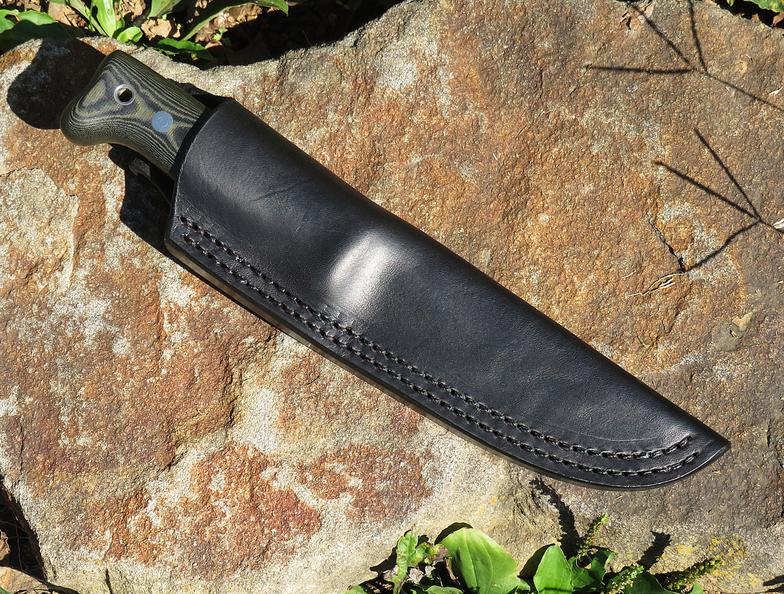 5/32 x 5" differentially hardened/tempered 01 high carbon steel blade w/flat saber-ground bevels, non-tapered tang & blued finish. Unpolished green & black linen Micarta handle w/(2) stainless steel Loveless bolts & lined lanyard hole. Right hand black molded leather traditional-style sheath.