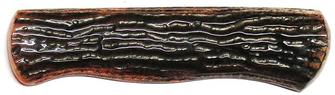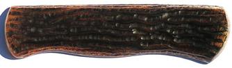 Custom Jigged & antiqued Moose Antler: Moose antler typically loses all of its dark-grooved outer bark during handle contouring. To replace this unique feature many like, we are now able to offer custom hand-jigging after which the antler is dyed to an amber color w/darkened grooving duplicating the appearance of aged antler. It's a lengthy process to produce these handles but creates the look is outstanding. Perfect for historical reproductions & knives you want to appear to have been used during the early American frontier. Handle scales are completed hand-polished finish.