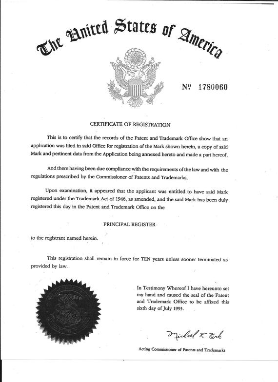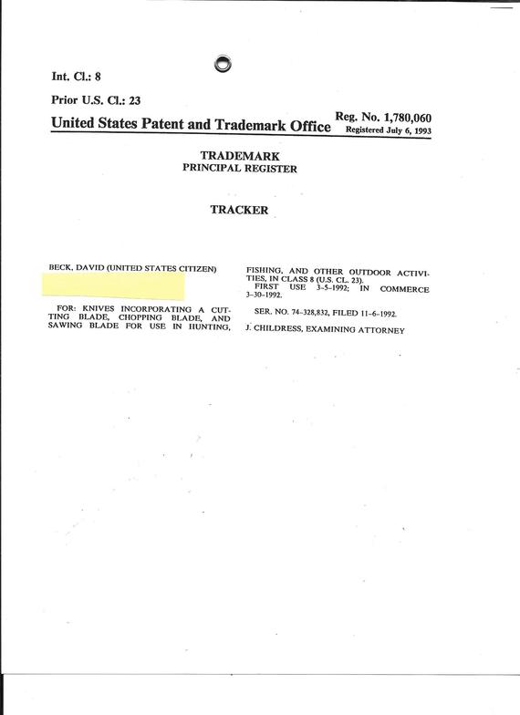 Above: Official documentation of our TRACKER knife trademark issued in 1993 by the US Patent & Trade Office.
