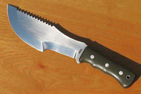 Shown with a wet-sanded finish & unpolished OD green linen Micarta handle w/std. stainless steel Loveless bolts & lined lanyard hole. 1/4 x 7-1/4" differentially heat treated 01 high carbon steel blade w/flat-ground bevels, standard saw teeth & tapered tang.